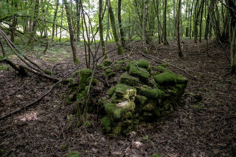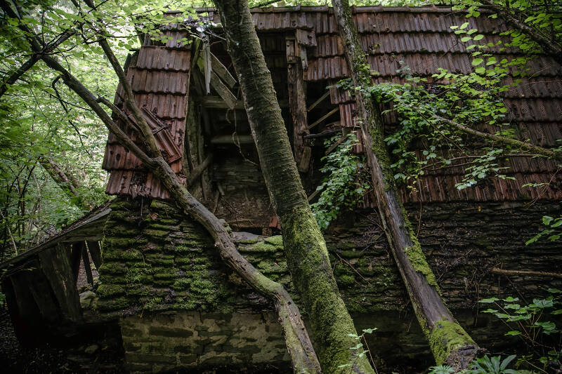 Il sentiero dell'alchimista parte poco lontano dalla casa. Si prosegue verso il borgo Benedet, abbandonato nel 1966 a causa di un'alluvione. I resti delle case nel fitto bosco sfidano il tempo e sembrano non voler cedere al marciume dell'umidità che li tutto avvolge. In quel silenzio accompagnato dai tenui rumori del sottobosco e dal continuo stillicidio dell'umidità, il sentierino, resosi ancora più scivoloso a causa della forte pioggia della notte precedente si snoda attraverso una natura rimasta selvaggia. Proseguo ancora per qualche centinaio di metri, poi il sentiero sparisce nella boscaglia. Con l'aiuto del gps mi accingo a continuare fuori sentiero diretto verso il piccolo borgo di Teno.