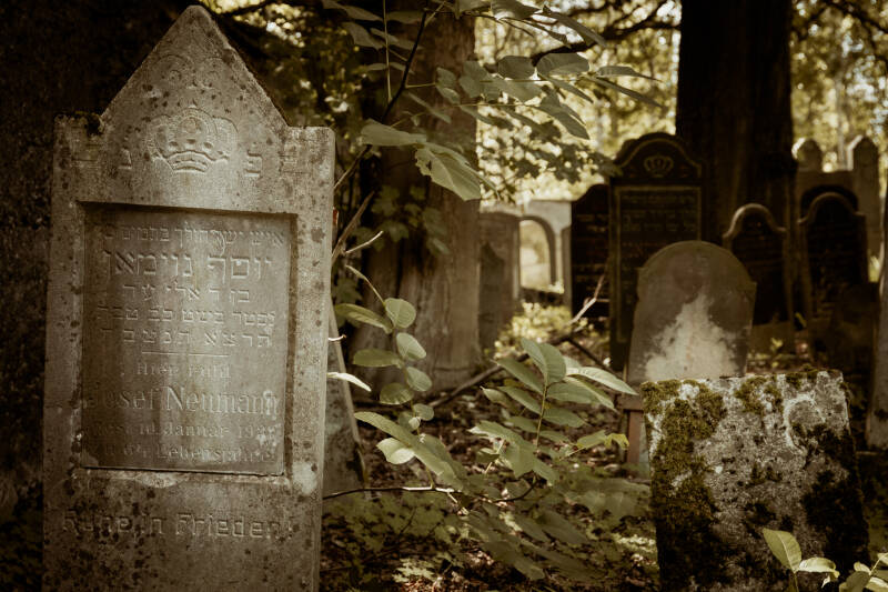 La gran parte delle epigrafi parla in ebraico, una lingua che, ahimè, non possiedo. Altre non parlano più: la pietra, consumata dal tempo, ha cancellato i nomi e l’identità di chi vi riposa. Qua e là compaiono iscrizioni in tedesco o in polacco, abbastanza integre da permetterci di ricostruire, almeno in parte, le loro vicende. Nell’Ottocento e fino ai primi decenni del Novecento era consuetudine aggiungere brevi note biografiche sulle lapidi. È così che, leggendo, abbiamo incontrato le tombe di ricchi commercianti, di soldati ebrei che combatterono nella Seconda guerra mondiale, di sopravvissuti ai campi di sterminio.