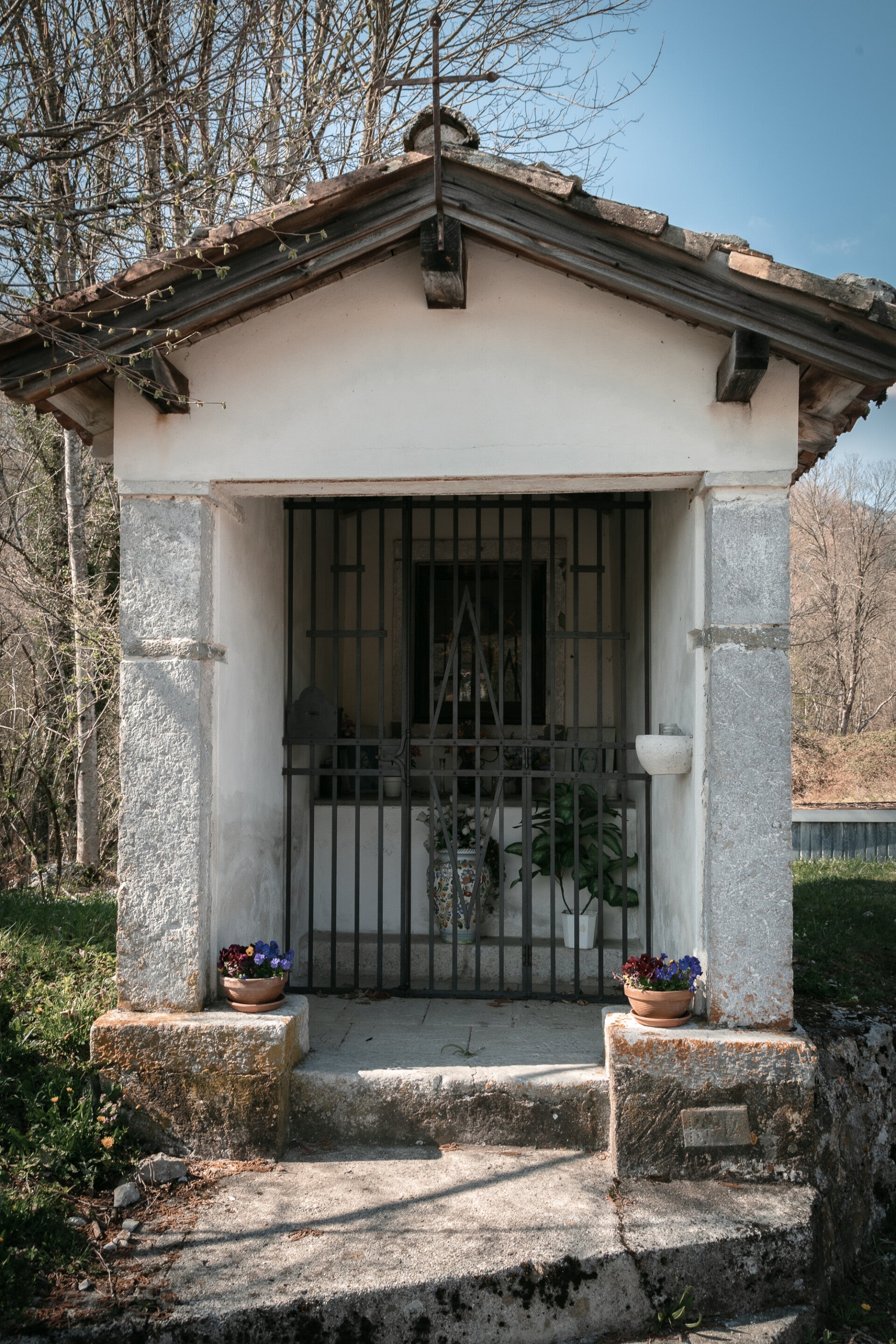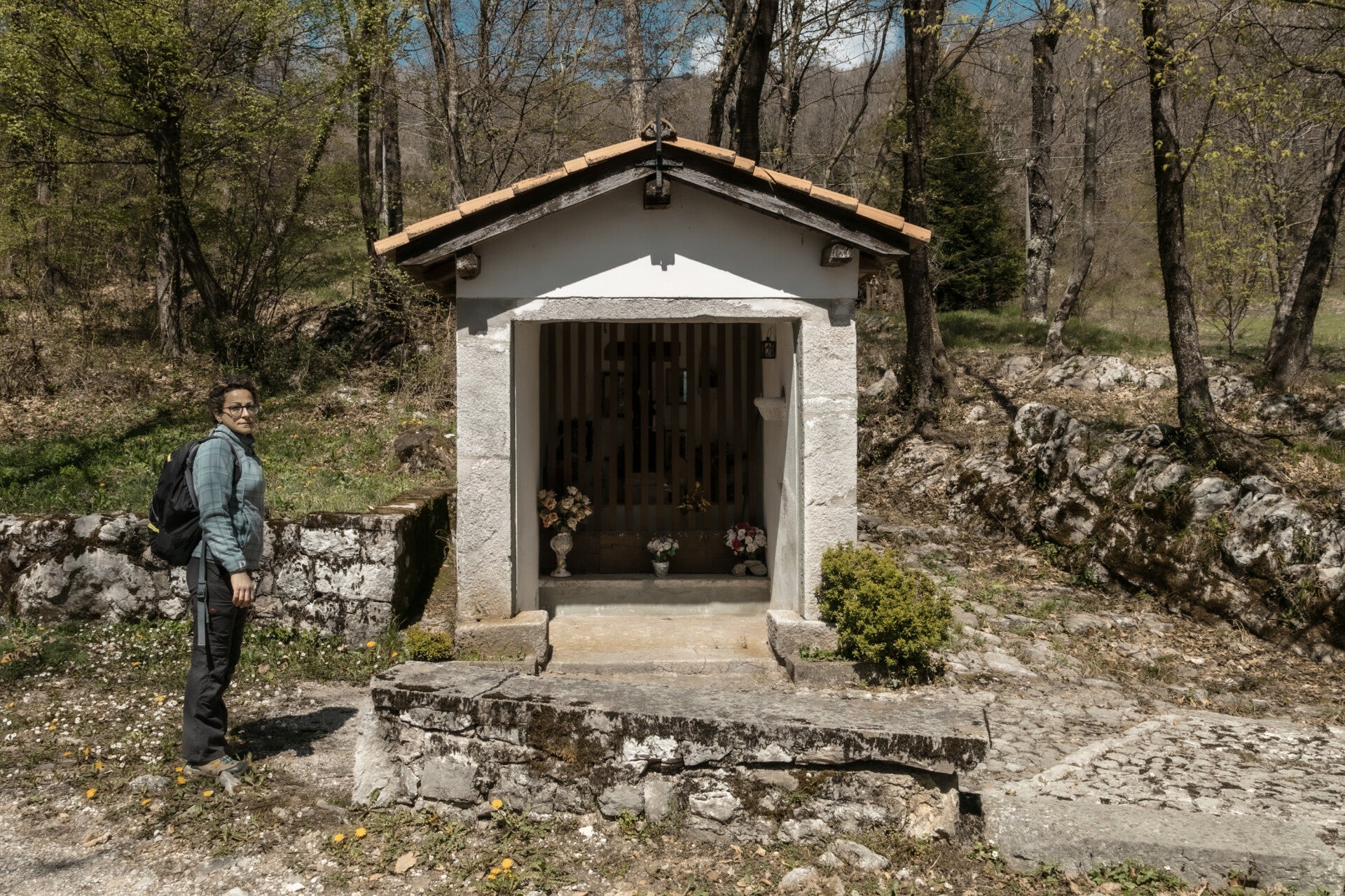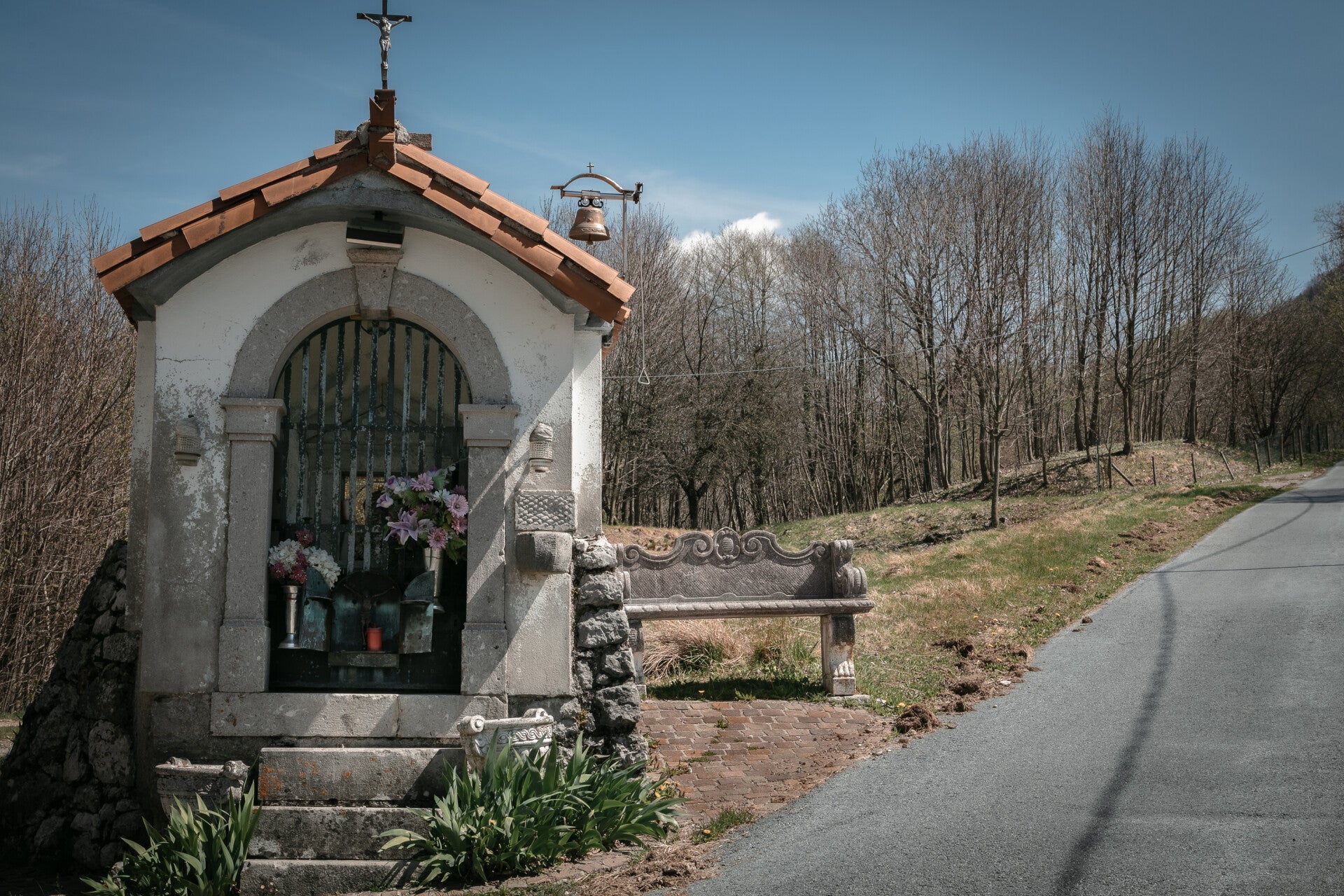 Tra queste, spicca quella nascosta nel bosco vicino a Cornial, dove un’acquasantiera in pietra che risale al 1748 sembra custodire, nel silenzio delle fronde, lo spirito più autentico di questo territorio. Lungo l'intero itinerario, colpisce la ricorrente architettura delle ancone votive, quasi tutte caratterizzate da una struttura a portico libero. È un dettaglio che racconta una doppia anima: santuari in miniatura per la sosta dell'anima e, al contempo, solidi rifugi contro la pioggia e il vento per chiunque si trovasse in cammino.